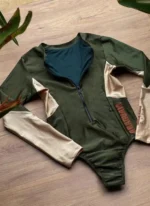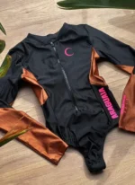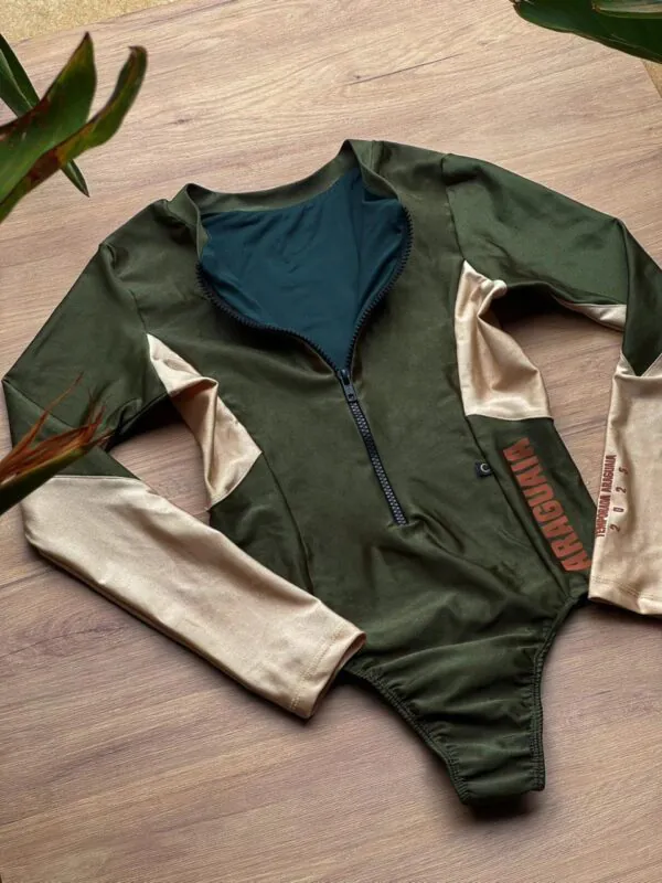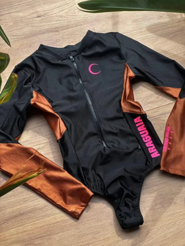 Produzido em Suplex de Poliamida Santa Constância (90% Poliamida e 10% Elastano), o body entrega alta compressão, secagem rápida, toque macio e proteção solar FPU50+, ideal para dias de sol intenso. A modelagem com manga longa e zíper funcional frontal permite ajuste personalizado e favorece diferentes estilos de uso — mais fechado para esportes aquáticos ou aberto para um visual mais ousado e descontraído.