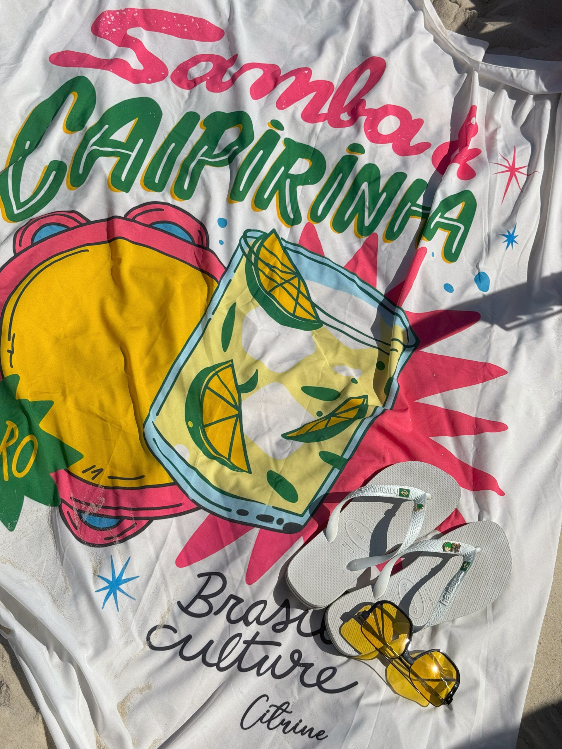 O espírito do Brasil em cada detalhe. A Saída de Banho Havaí Caipirinha & Samba traduz a alegria brasileira em uma estampa vibrante, com cores pop e elementos icônicos como o tamborim e o copo de caipirinha. Uma peça que transmite frescor, energia e ousadia, perfeita para a mulher Citrine que vive o verão com autenticidade e confiança.